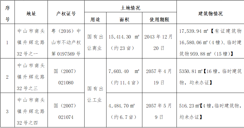 其主要資產是廣東省中山市南頭鎮升輝北路32號的三宗房地產,土地面積27,502.40㎡(約41畝)、建筑面積23,406.98㎡(有證建筑物16,580.06㎡、臨時建筑物6,826.92㎡)。具體如下: